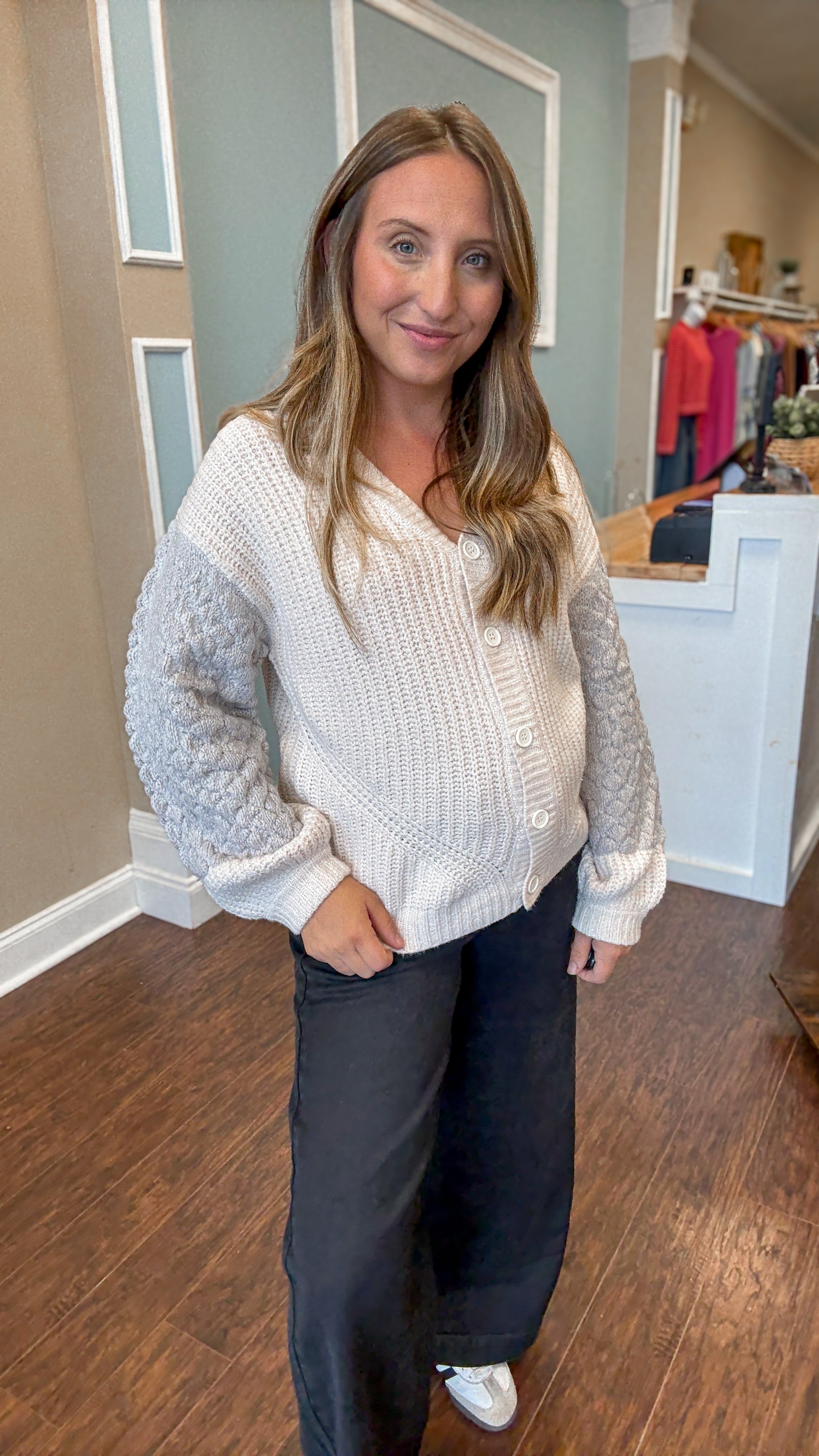 Your favorite fall outfits just met their match with our Brielle Mixed Stitch Cardigan. Chunky mixed knit shapes, this cute cardi-style sweater framed by balloon sleeves. The cozy relaxed sweater has a button-front before ending at a straight hem.