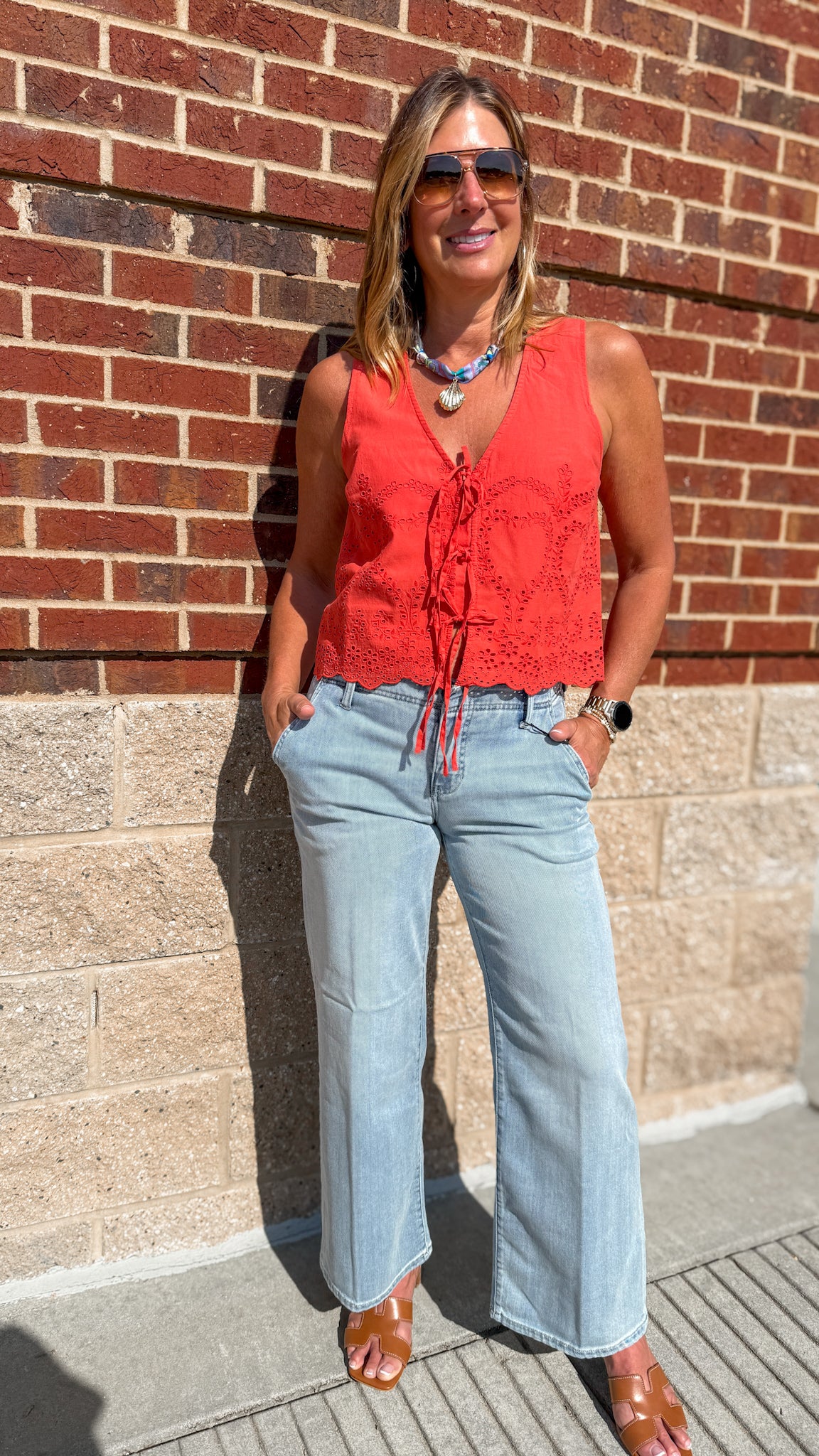 The Rhea top is made of a cotton fabric with an embroidered eyelet design and is fully lined. Features include a v-neckline and front tie closure.